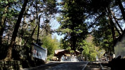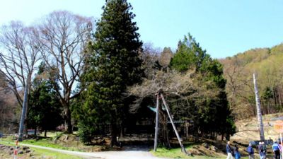 =根入りの杉= 秋宮の境内でひときわ目立つのが、神楽殿の前にそびえる巨木である。 根入りの杉と言い、樹齢は700年とのこと。 「根入り」は、実際には、「寝入り」の意味らしく、丑三つ時になると枝を垂らしていびきをかくと伝えられる。 |